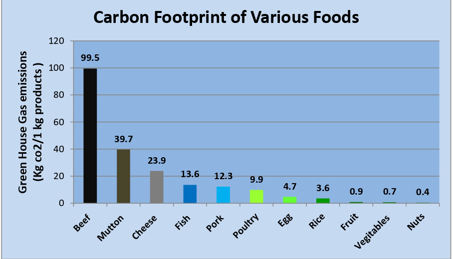ഭക്ഷ്യമേഖലയില്‍ ഹരിതഗൃഹ വാതകങ്ങളുടെ വിസര്‍ജ്ജനത്തില്‍  മുഖ്യപങ്ക് വഹിക്കുന്നത് മാംസ ഉല്പാദനമാണ്. മൃഗപരിപാലനത്തിനും തീറ്റയുല്പാദനത്തിനും ധാരാളം ഭൂമിയും പ്രകൃതിവിഭവങ്ങളും ഉപയോഗിക്കേണ്ടിവരുന്നു. ഒരു കിലോഗ്രാം അരി ഉല്പാദിപ്പിക്കാന്‍ 2497 ലിറ്റര്‍ വെള്ളം മതിയെങ്കില്‍  ഒരു കിലോഗ്രാം മാംസം ഉല്പാദിപ്പിക്കാന്‍ 15415 ലിറ്റര്‍ വെള്ളം വേണം. ഈ രീതിയില്‍ വിവിധ പ്രകൃതിവിഭവങ്ങള്‍ ഭീമമായ തോതില്‍ ഉപയോഗിക്കുന്നതുകൊണ്ടാണ് മാംസത്തിന്‍റെ കാര്‍ബണ്‍ കാല്പാട് ഭീമമാകുന്നത്. കൂടാതെ മൃഗങ്ങളില്‍നിന്ന് പ്രത്യേകിച്ചും പശുക്കളിനിന്ന് വലിയ അളവില്‍ മീഥേന്‍ വിസര്‍ജ്ജിക്കപ്പെടുന്നുണ്ട്. ഭക്ഷ്യമേഖലയില്‍നിന്നും ഉണ്ടാകുന്ന ഹരിതഗൃഹ വാതകങ്ങില്‍ 11 ശതമാനവും മൃഗങ്ങളാണ് ഉല്പാദിപ്പിക്കുന്നത്.